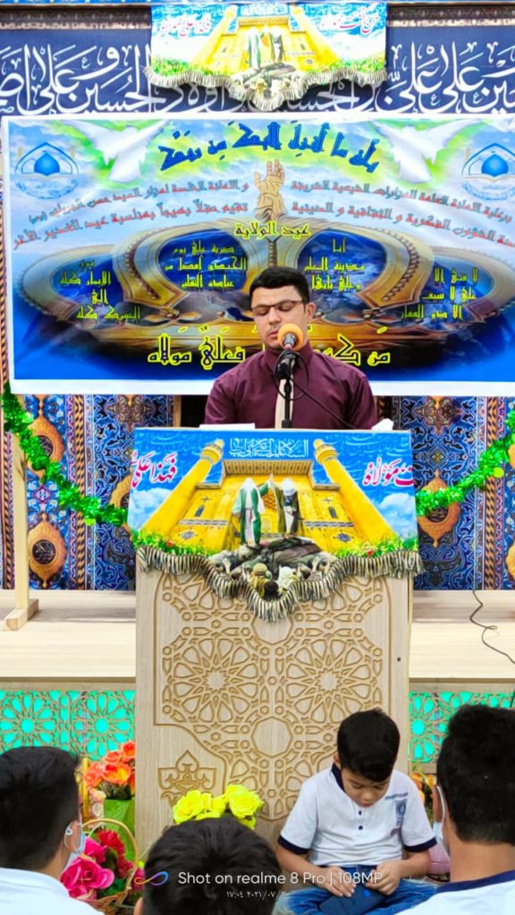 أقامت الأمانةُ الخاصّة لمزارِ السيد حسن الجبيليّ (رضوان الله تعالى عليه) / وحدة الشؤون الفكريّة والثقافيّة والدينيّة في البصرة حفلاً دينيّاً بهيجاً بعيد الله الأكبر عيد الغدير الأغر ، حيثُ اُفتتحَ المحفلُ بتلاوةِ القُرآن الكريم لمُعلم علوم القُرآن في المزارِ السيد حيدر الخرسان ، ومن ثمَّ فقرة أسئلة حول المُناسبة المُباركة ، وشنف أسماع الحضور بالأناشيد والأهازيج الولائية الرادود الملا فاضل الرفاعيّ .