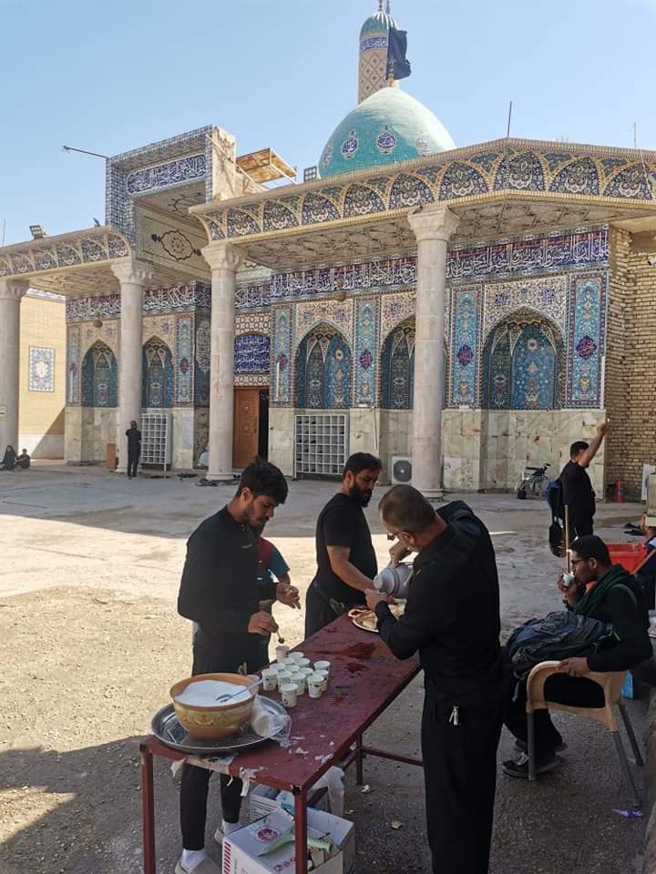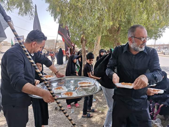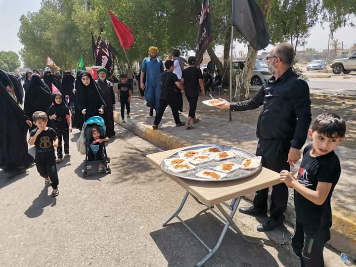 إذ تمَّ توزيع الماء البارد والشاي والكعك ووجبات الفطور والغداء للزائرين في المزارِ الشريف وعلى طريق المشاية في مدينة طويريج .