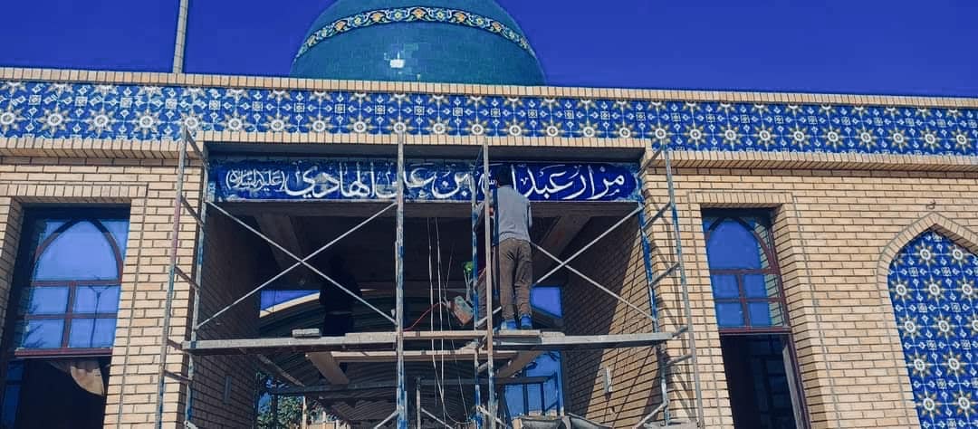 يتوسطها اسم المرقد المُطهر … إدارة مزار السيد عبد الله بن الإمام علي الهاديّ (عليه السَّلام) تُكمل تغليف واجهة الاستعلامات الداخلية