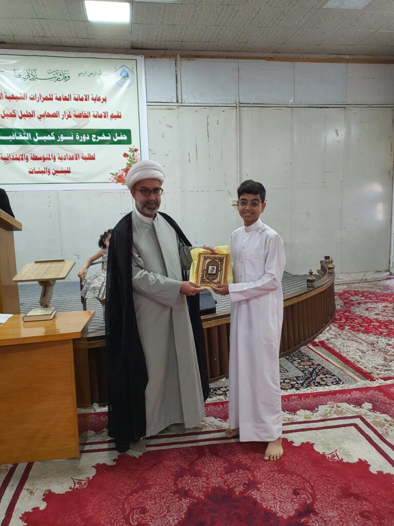 اختتمت الامانةُ الخاصّة لمزارِ الصحابي الجليل كُميل بن زياد النخعيّ (رضوان الله تعالى عليه) دورتها الصيفية الثقافية السنوية والتي دُرس فيها القرآن ،والفقه ، والعقائد ، والأخلاق ، والسيرة ، خلال العطلة الصيفية لأبنائنا وبناتنا من طلبة الدراسة الإعدادية والمتوسطة والابتدائيّة بإقامة حفلاً دينياً بهيجاً.