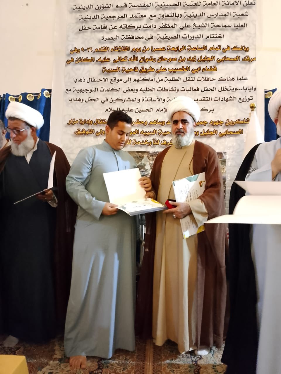 أقامت الأمانة الخاصّة لمزار الصحابيّ الجليل زيد بن صوحان العبدي (رضوان الله تعااى عليه) في البصرة حفل لإختام الدورات الصيفيّة بالتعاون مع الأمانة العامّة للعتبة الحُسينية المُقدسة / قسم الشؤون الدينية – شعبة المدارس الدينيّة