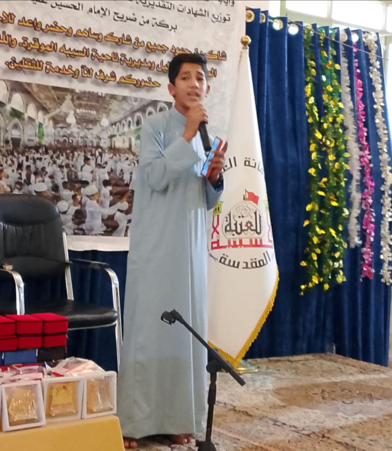 هذا وتمّ توزيع شهادات الشكر والتقدير على الطلبة المُتفوقين تقديراً لِجهودهم وتفوقهم ، كما تمّ تقديم درع شكر وتقدير الى نائب الأمين الخاص للمزار عرفاناً بجهوده المبذولة في خدمة المَشروع القُرآني والدينيّ .