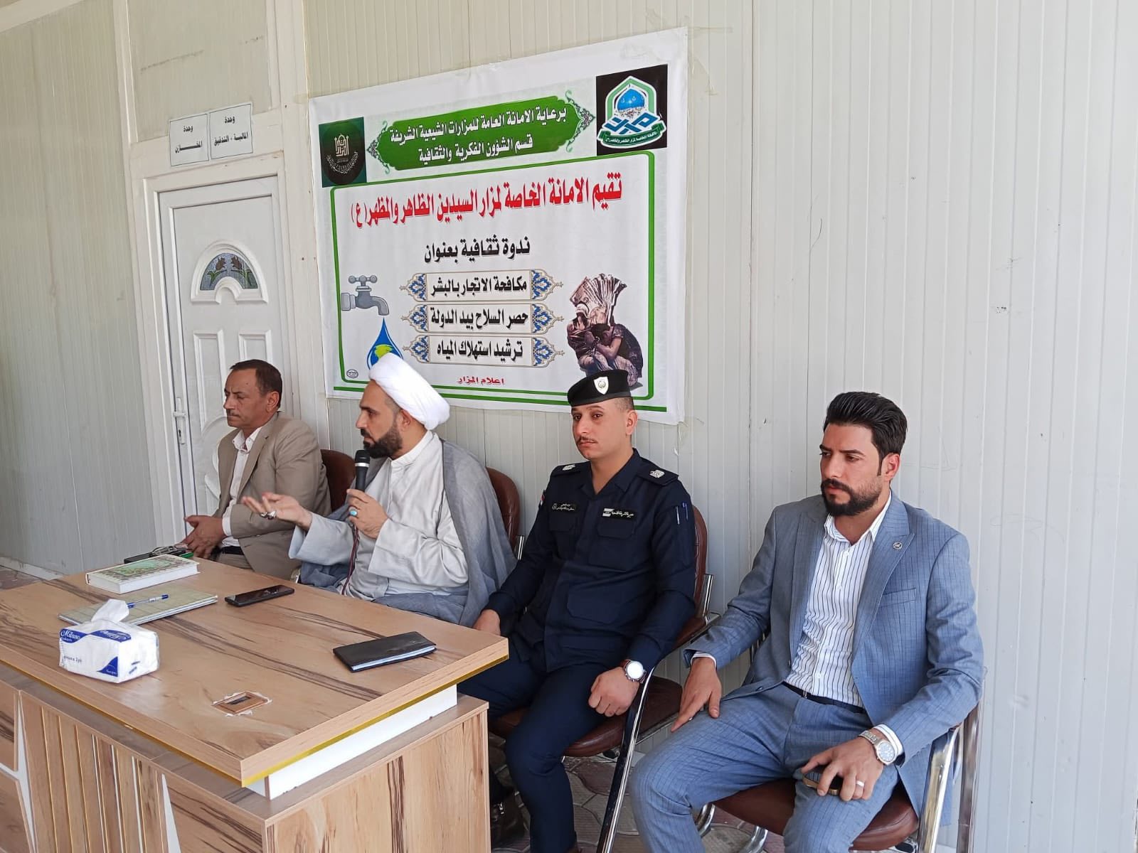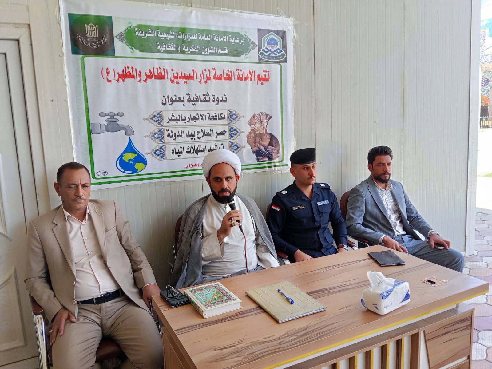 برعاية الأمانة العامة للمزارات الشيعية الشريفة أقامت الأمانة الخاصّة لمزار السيدين الظاهر والمظهر (رضوان الله تعالى عليهما) في بابل ندوة ثقافية توعوية حملت عناوين بالغة الأهمية حول الاتجار بالبشر وحصر السلاح بيد الدولة وترشيد استهلاك المياه.