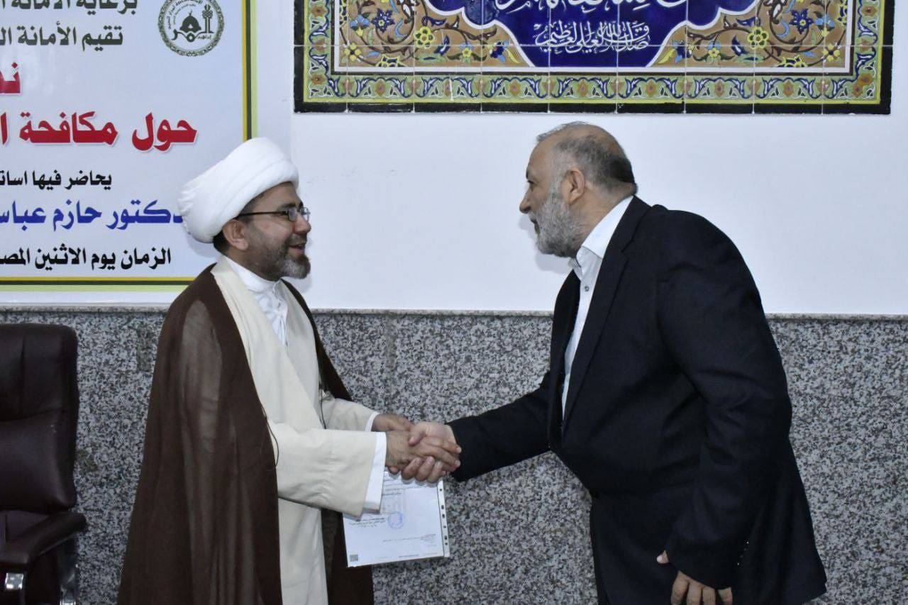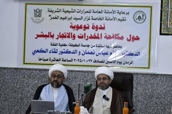 برعايةِ الأمانةِ العامّةِِ للمزاراتِ الشّيعيّةِ الشّريفةِ ، أُقيمت في مزار السّيد إبراهيم الغمر (رضوان الله تعالى عليه) في النَجف الأشرف ندوة تَوعوية تناولت ” مكافحة المُخدرات وظاهرة الإتجار بالبشر” بِحضور جمعٍ من الزائرين .