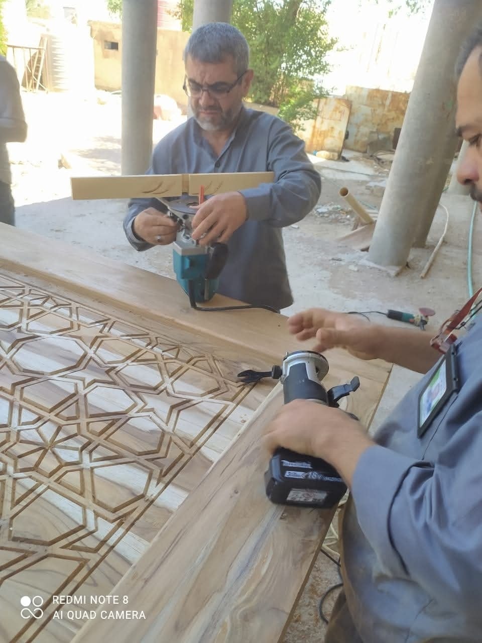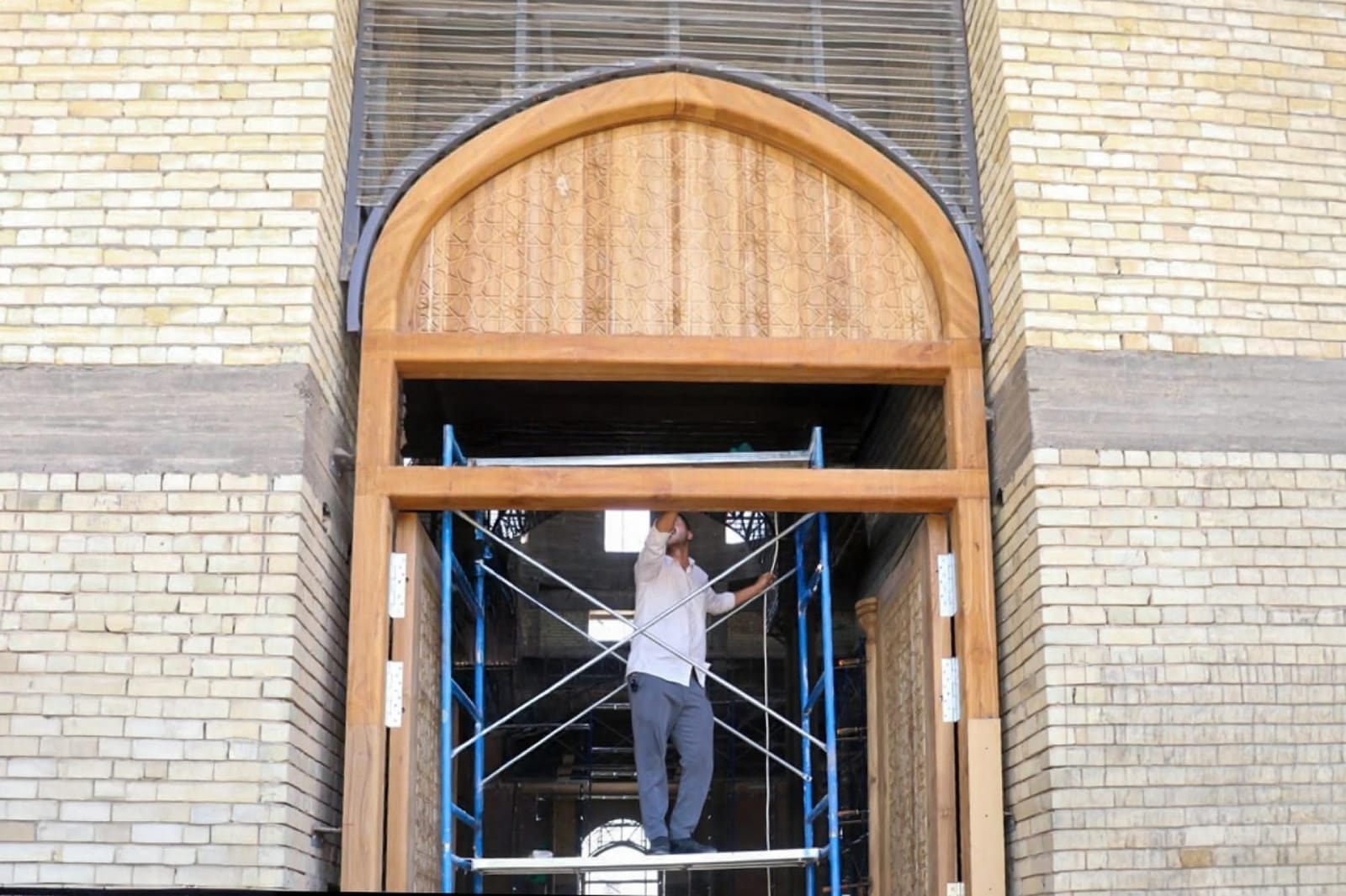 وجرى إنجاز نجارة الأبواب من خشب الساج البورمي على أيدي كادر قسم صناعة شبابيك الأضرحة الشريفة وأبوابها التابع للعتبة العباسية المُقدسة ، وبإشراف ورعاية مباشرة من قبل الأمانة العامّة للمزارات الشيعيّة الشريفة/القسم الهندسي ، ومُتابعة الأمانة الخاصّة للمزار الشريف.