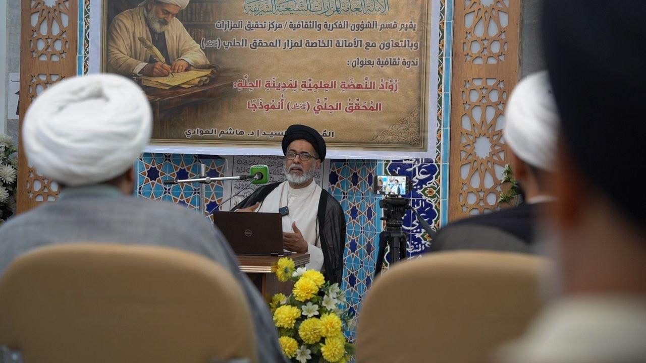 وتضمّنت الندوة محاضرة ألقاها الدكتور السيد هاشم العوادي تناول فيها مكانة المحقق الحلي العلمية وإسهامه في ترسيخ قواعد الفقه الإسلامي ، فضلاً عن دوره البارز في النهضة العلمية التي شهدتها مدينة الحلة، مؤكداً على ضرورة عدم الوقوف عند حدود التعريف بالمحقق الحلي كمحقق وعالم فحسب، بل التمعن في نتاجه الفكري والعلمي والعمل على تصدير هذا النتاج إلى المجتمع، من خلال تدريسه وتبسيط مفاهيمه وإبراز أفكاره بما يسهم في ترسيخ الوعي العلمي والاستفادة من إرثه المعرفي في الواقع المعاصر .