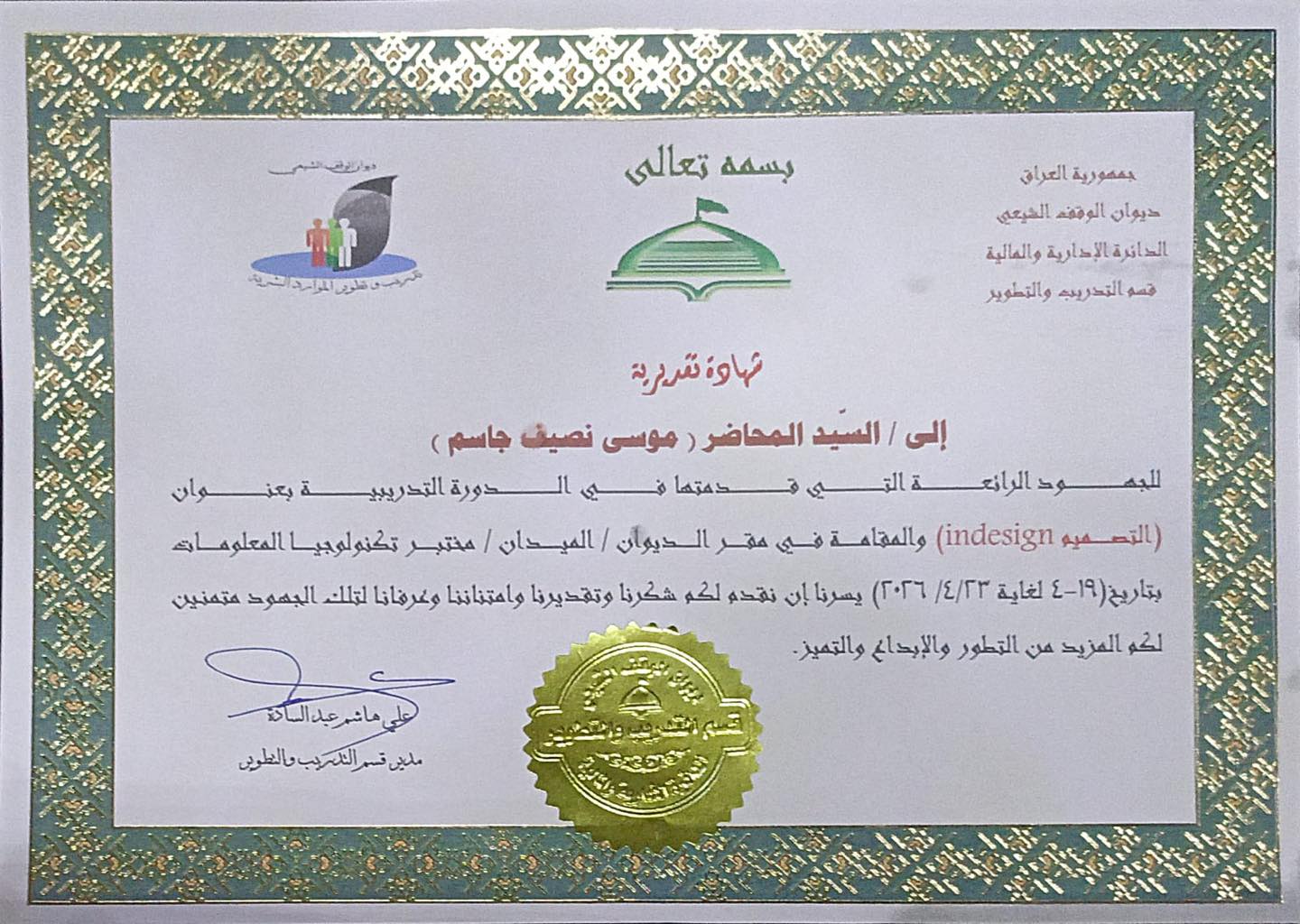 بالتعاون مع قسم الإعلام والعلاقات العامة في الأمانة العامة للمزارات الشيعية الشريفة، نظّم قسم التدريب والتطوير في الدائرة الإدارية والمالية لديوان الوقف الشيعي دورة تدريبية تخصصية في برنامج (Adobe InDesign) بمقر الديوان في بغداد، ضمن خطته لتطوير المهارات الرقمية للموظفين.